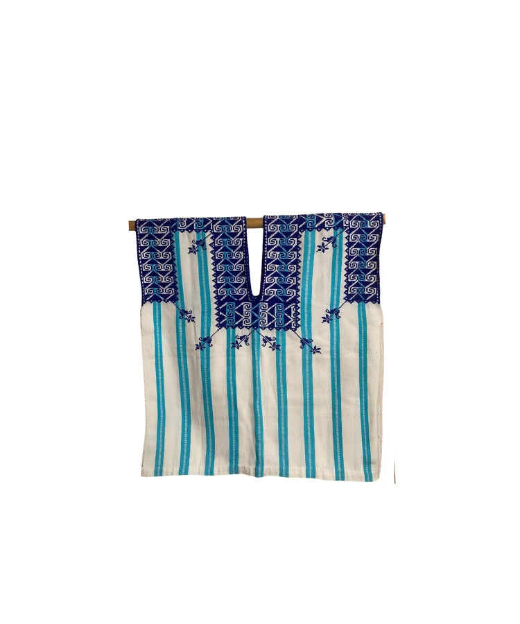 Esta pieza ha sido realizada con la técnica de telar de cintura en dos lienzos con bordado en punto de cruz y cerrado con randa tradicional. Elaborado en la Sierra p'urhepecha.